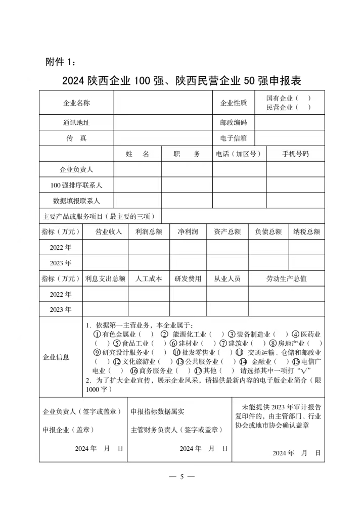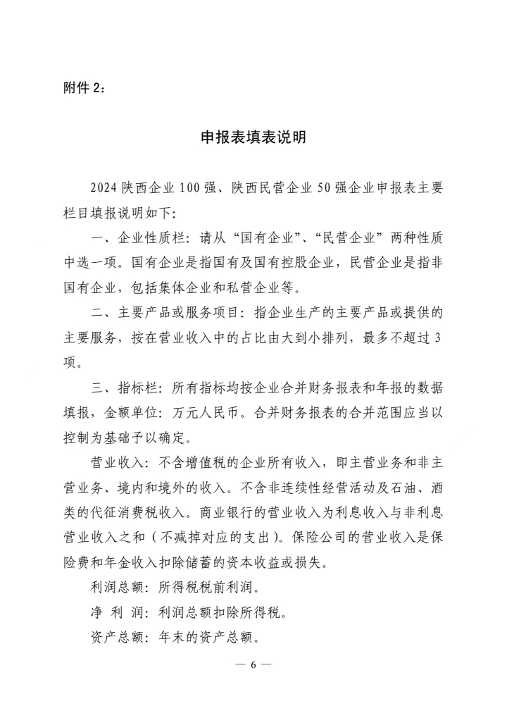各有關(guān)企業(yè)、協(xié)會和有關(guān)單位: 中國企業(yè)聯(lián)合會/企業(yè)家協(xié)會(以下簡稱中企協(xié))連續(xù)22年向社會發(fā)布了中國企業(yè)500強榜單及《中國500強企業(yè)發(fā)展報告》,全國大部分省市區(qū)先后開展了地區(qū)企業(yè)100強排序發(fā)布工作。 2012年,經(jīng)省政府領(lǐng)導(dǎo)同意,在省發(fā)改委、工信廳、財政廳、人社廳、商務(wù)廳、國資委、統(tǒng)計局、地方金融監(jiān)管局、省總工會等政府部門的大力支持下,我會連續(xù)12年開展了“陜西企業(yè)100強”排序和發(fā)布工作,連續(xù)5年發(fā)布了陜西民營企業(yè)50強榜單,并編印出版了《陜西100強企業(yè)分析報告》(以下簡稱《百強企業(yè)分析報告》),受到了政府部門、企業(yè)及媒體等社會各界的普遍歡迎和廣泛認(rèn)可。 為深入貫徹落實黨的二十大精神和習(xí)近平總書記歷次來陜考察重要講話重要指示精神,認(rèn)真落實中央經(jīng)濟工作會議部署要求,引導(dǎo)我省企業(yè)全面貫徹新發(fā)展理念,培育發(fā)展新質(zhì)生產(chǎn)力,賦能企業(yè)高質(zhì)量發(fā)展,為推進中國式現(xiàn)代化陜西新篇章做出積極貢獻,我會決定繼續(xù)開展2024陜西企業(yè)100強和陜西民營企業(yè)50強排序發(fā)布活動。 依據(jù)2023年企業(yè)營業(yè)收入,我會在政府有關(guān)部門和各行業(yè)協(xié)會、各地方企業(yè)家協(xié)會/企業(yè)聯(lián)合會的支持下,在以往工作的基礎(chǔ)上,初步確定貴企業(yè)為2024陜西100強或陜西民營50強候選企業(yè),希望貴企業(yè)能按要求及時申報?,F(xiàn)將排序的有關(guān)事項通知如下: 一、排序原則 排序依據(jù)2023年度營業(yè)收入,在企業(yè)自愿申報基礎(chǔ)上,由陜西百強企業(yè)排序?qū)彾ㄎ瘑T會統(tǒng)一審核,形成客觀公正的排序結(jié)果。 二、申報資格 凡在陜西省境內(nèi)注冊、獨立核算的企業(yè)均有資格申報參加排序(不包括行政性公司、資產(chǎn)經(jīng)營公司、外資企業(yè),但包括在境外注冊、投資主體為中國自然人或者法人、主要業(yè)務(wù)在境內(nèi)的企業(yè))。屬于集團公司的,只能由母公司申報,在陜西境內(nèi)的中央直屬企業(yè)可獨立申報。申報2024陜西100強的企業(yè),2023年營業(yè)收入應(yīng)達(dá)到20億元(人民幣);申報2024陜西民營50強的企業(yè),2023年營業(yè)收入應(yīng)達(dá)到5億元(人民幣)。 為了保證數(shù)據(jù)的客觀公正,申報企業(yè)需要提供由會計師事務(wù)所或?qū)徲嫏C構(gòu)確認(rèn)的審計報告復(fù)印件。未能提供的,需提交能夠證明企業(yè)數(shù)據(jù)真實性的可靠材料,如可由審計機構(gòu)、行業(yè)協(xié)會、地市協(xié)會或主管部門蓋章確認(rèn)。凡只提供企業(yè)申報表或者數(shù)據(jù)不完整又無法確認(rèn)的,均不納入排序范圍。 三、指標(biāo)填報 2024陜西企業(yè)100強、陜西民營企業(yè)50強排序工作按照國際通行的方式,參照世界企業(yè)500強和中國企業(yè)500強排序辦法,依據(jù)企業(yè)2023年度的營業(yè)收入進行排序。同時設(shè)置利潤總額、資產(chǎn)總額、納稅總額、從業(yè)人數(shù)等多項指標(biāo)(詳見附件),對100強企業(yè)進行綜合分析,編印《百強企業(yè)分析報告》。 四、排序工作的申報及發(fā)布 (一)申報。滿足申報條件的企業(yè)從接到通知之日起即可抓緊準(zhǔn)備資料,按要求填寫申報表。為了盡可能與中企協(xié)開展的中國企業(yè)500強排序接軌,保持同步運作,希望我省符合條件的大企業(yè)大集團積極主動參與申報,于2024年6月30日前完成申報工作。申報表請登陸我會網(wǎng)站www.hshancai.com“相關(guān)下載”欄目下載。 (二)審定。企業(yè)申報結(jié)束后,我會對企業(yè)申報材料進行審核匯總,提出排序初步名單,編寫《百強企業(yè)分析報告》草稿。隨后召開陜西企業(yè)100強及民營企業(yè)50強排序?qū)彾ㄎ瘑T會會議,審議由我會擬定的排序名單和《百強企業(yè)分析報告》,確定最終排序結(jié)果。 (三)發(fā)布。我會擬在今年第四季度舉行百強企業(yè)排序發(fā)布會,向社會公布“2024陜西企業(yè)100強”、“2024陜西民營企業(yè)50強”排序名單,發(fā)布《百強企業(yè)分析報告》,邀請省內(nèi)主要媒體對排序發(fā)布工作進行廣泛深度宣傳報道。 五、聯(lián)系方式 聯(lián) 系 人:劉會琴 白朝霞 張家赫 電話及傳真:029-85227536 88211873 電子信箱:sxsqyjxh@163.com 陜西百強企業(yè)QQ群號:399353854 地 址:西安市長安北路14號省體育場朱雀國際商務(wù)中心五層B203室 郵政編碼:710061 附件1: 2024陜西企業(yè)100強、陜西民營企業(yè)50強企業(yè)申報表 附件2:申報表填表說明 2024年3月27日 附關(guān)于申報2024陜西企業(yè)100強及民營企業(yè)50強的通知PDF版:相關(guān)附件下載 附2024陜西100強企業(yè)、陜西民營企業(yè)50強企業(yè)申報表、申報說明Word版:相關(guān)附件下載